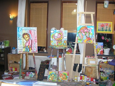 peinture acrylique sur toile bois et divers matériaux, dessin, graphisme virtuel, performances en directe avec différents groupes et musiciens, action painting, installations, sculpture en bois métal et divers matériaux, etc...
